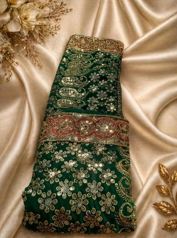 This Eden Green Pure Silk Saree is designed for those who love a rich and elegant look. The deep green (Eden Green) base is beautifully enhanced with heavy chumki (sequins) work that reflects light and creates a striking appearance.