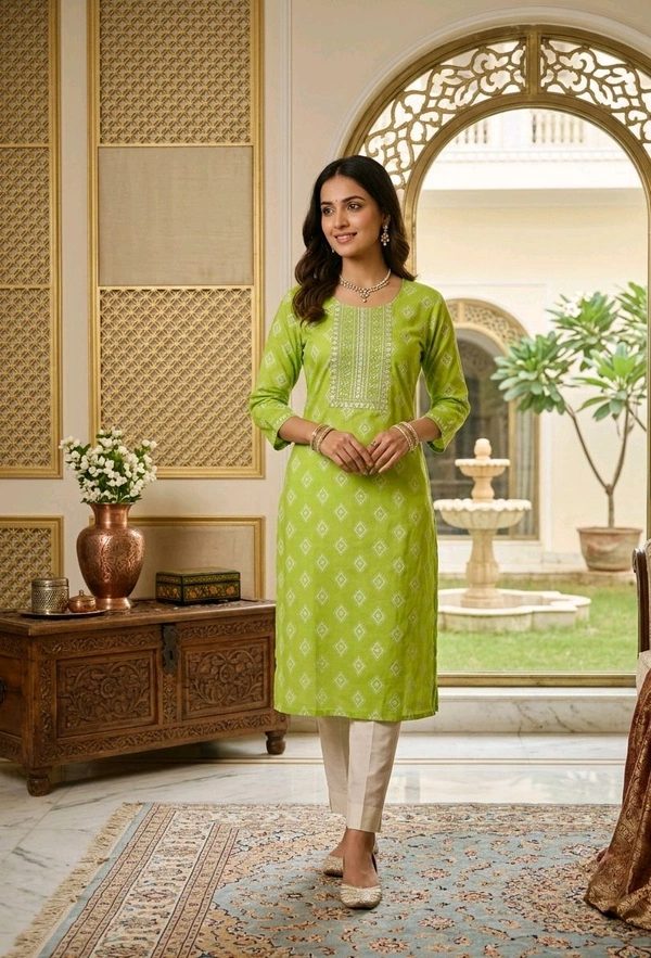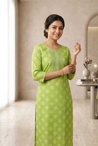 Add a fresh and graceful touch to your wardrobe with this elegant Sushi straight kurti. Featuring delicate embroidery on the front panel and subtle printed motifs across the fabric, this kurti beautifully blends simplicity with sophistication. The classic round neckline and three-quarter sleeves give it a timeless and comfortable look, perfect for everyday wear, casual outings, or small gatherings. Made from soft and breathable fabric, it ensures all-day comfort while maintaining an effortlessly stylish appearance.