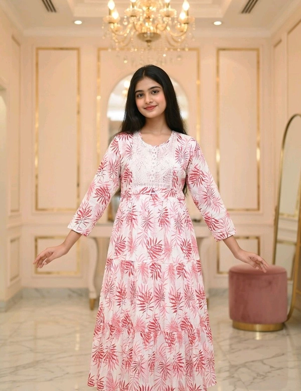 Elegant White & Rose Pink Floral Printed Cotton Gown