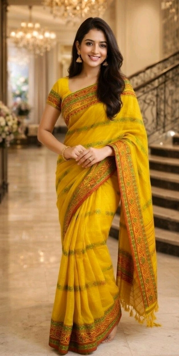Yellow Tant Saree with Traditional Green & Red Border