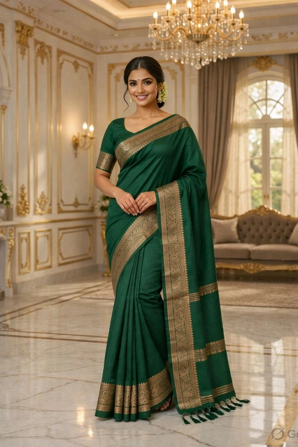 Blue Stone Cotton Green Handloom Saree with Golden Border | Elegant Traditional Saree for Women