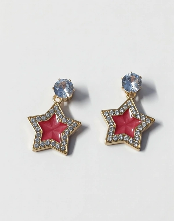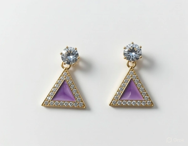 Add a cute and trendy touch to your jewelry collection with this Pack of 2 small size drop earrings. The set includes two stylish designs – a red star shape and a purple triangle shape, both beautifully decorated with sparkling crystal stones and finished with a shiny round stone stud.