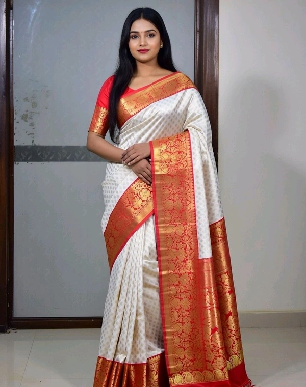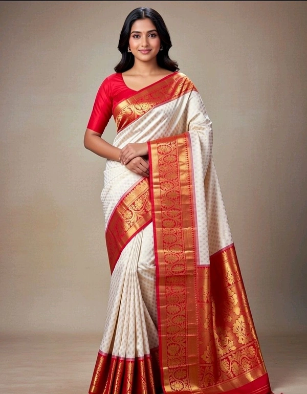 Jhim Buti Slik Saree in White with Red Border and Blouse Piece – Elegant Traditional Saree for Women | Festive & Party Wear