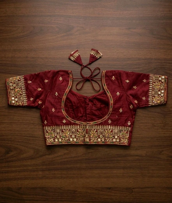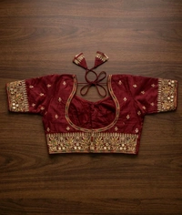 Add a touch of elegance to your saree look with this beautiful maroon designer blouse. Crafted from premium quality fabric, this blouse features delicate golden embroidery on the sleeves and back, giving it a rich and festive appearance. The front comes with a stylish V-neck design, while the back showcases a deep round neckline with adjustable dori tie-up and decorative tassels for a perfect fit.