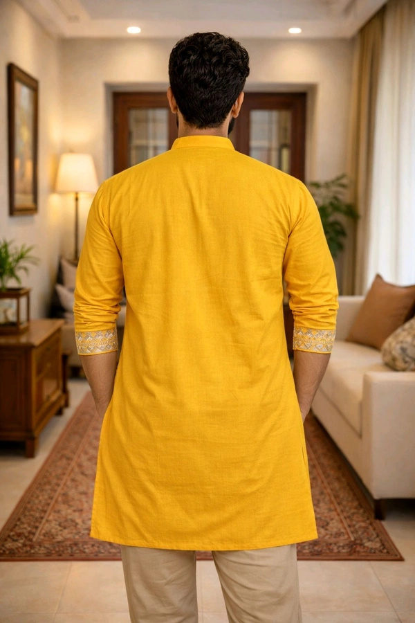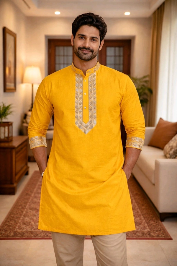 Men’s Cotton Embroidered Kurta | Mustard Yellow Ethnic Wear | Traditional Design | Full Sleeve | Size 42 | Length 42 | Only Kurta
