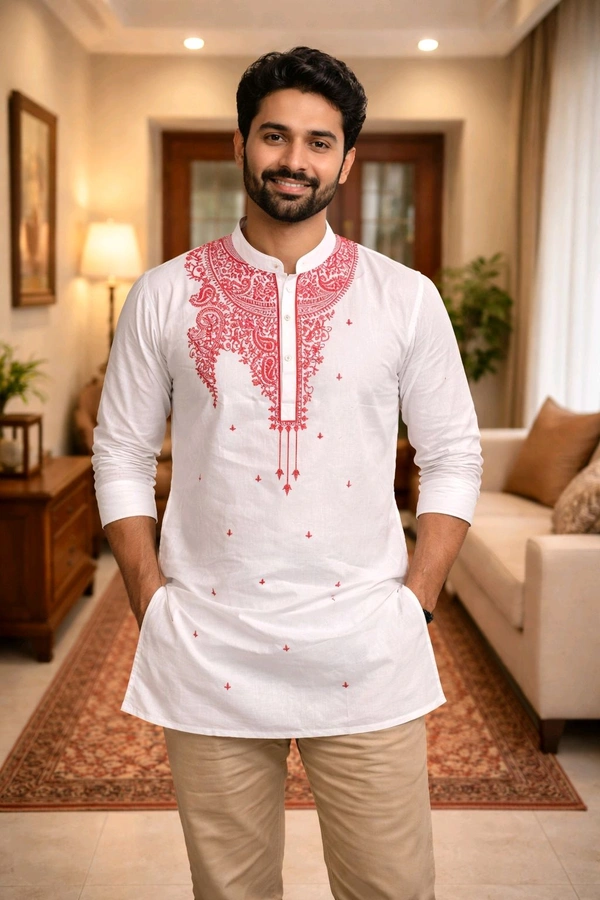 Upgrade your ethnic style with this elegant men’s embroidered kurta in a classic White colour with red traditional design. Made from soft and breathable cotton fabric, this kurta ensures all-day comfort with a premium look.