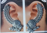 Add a bold ethnic touch to your look with these beautifully crafted oxidised silver earrings. Designed in an elegant leaf-inspired curved pattern, these earrings feature intricate detailing and a floral round centerpiece with small hanging beads for a graceful finish.