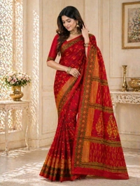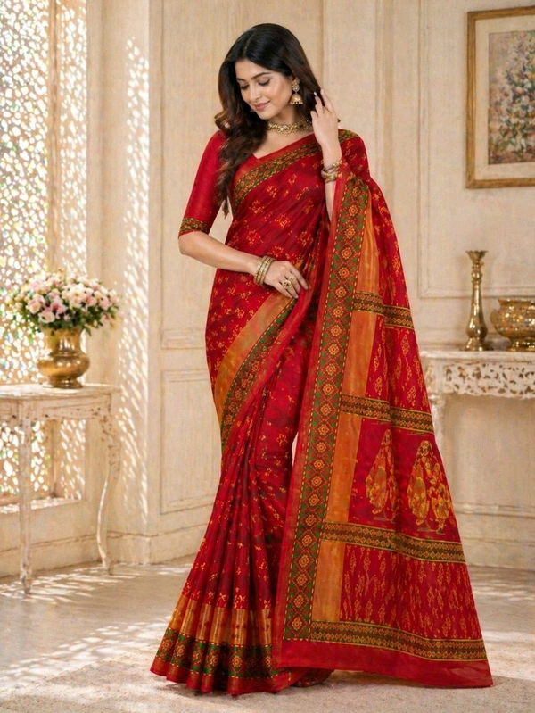 Premium Bright Red Traditional Printed Pure Cotton Saree (5.5 Meter)