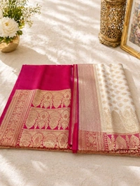 Premium Rani Pink & Off White Katan Banarasi Saree with Contrast Pallu and Blouse Piece