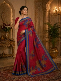 The saree features a rich wine red base highlighted with beautiful golden leaf motifs and a contrasting blue border, giving it a unique and graceful look. The pallu carries a stylish finish that adds to its overall charm.