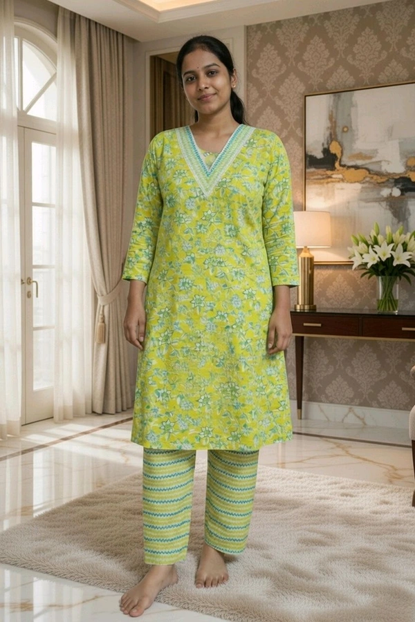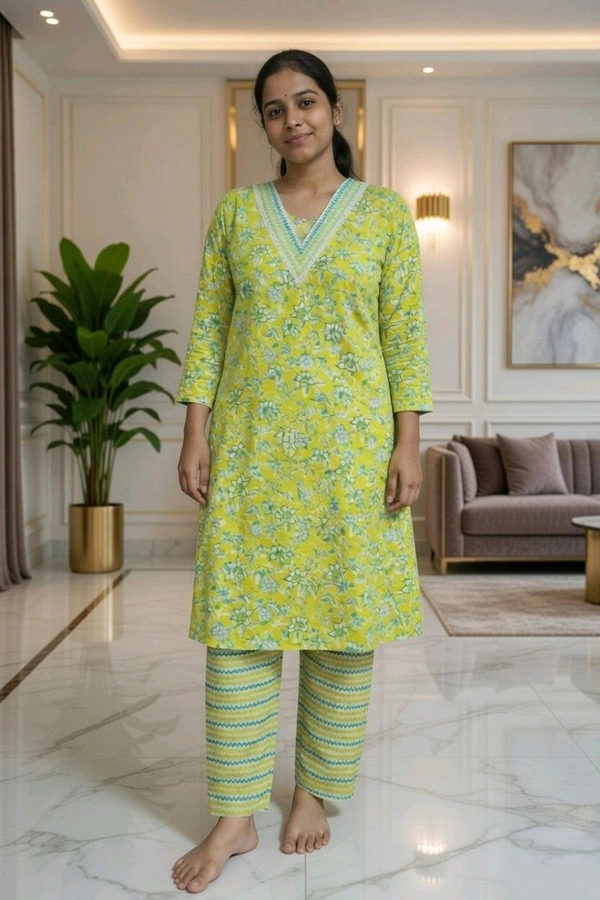 Stylish Lemon Yellow Floral Kurti with Matching Pant Set. Made of soft and breathable cotton fabric. Features trendy V-cut front neck and round back neck design. Knee-below length kurti with comfortable straight pant. Perfect for daily and casual wear. Available in XXL size.