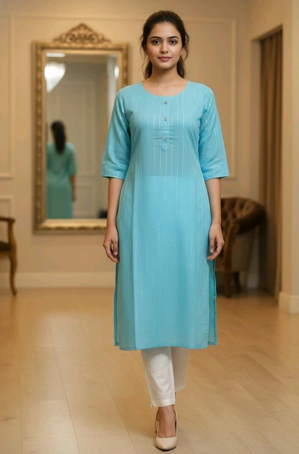 Women Solid Light Sky Blue Cotton Blend Round Neck Kurti (M Size, 3/4 Sleeve)