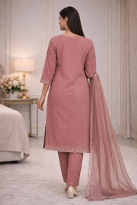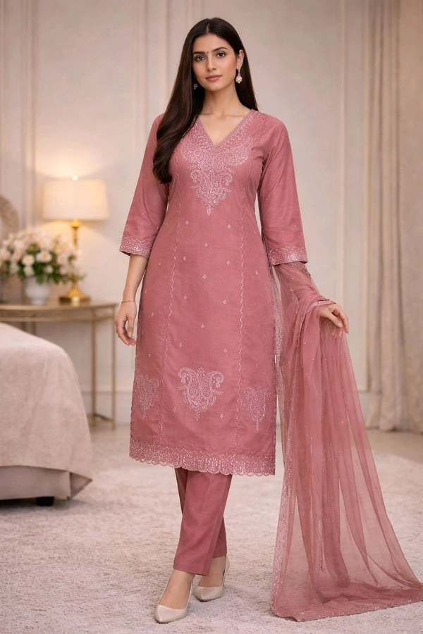 The kurta features beautiful embroidery work with fine detailing, adding a premium and sophisticated touch. It comes with a matching pant and a lightweight net dupatta with subtle embellishments, completing the perfect traditional outfit.